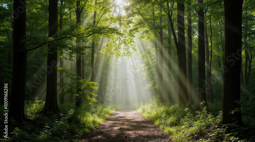 Naklejka premium Sunlit Forest Path: Ethereal Rays Illuminate Lush Green Woodland, Creating Magical Atmosphere on Dirt Trail Through Tranquil Nature Scene