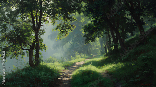 © Winston, Obraz premium Sunlit forest path green foliage morning mist serene