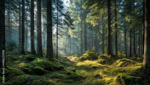 © Sahal, Fototapeta premium Sunlit Forest Path: Green Mossy Ground and Tall Trees