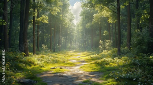 Obraz premium "Sunlit Forest Path in Lush Greenery, Ideal for Nature and Outdoor Projects"