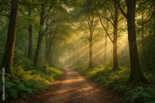 © Autthaphon, Fototapeta premium Sunlit Forest Path in the Morning