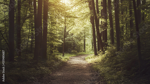 © Thanthara, Obraz premium Sunlit forest path leading into dense trees, creating serene atmosphere