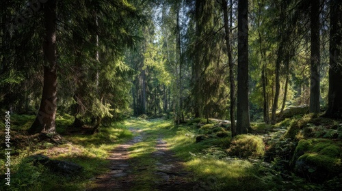 Obraz premium Sunlit Forest Path Leading Through Tall Trees, Evoking Tranquility and...