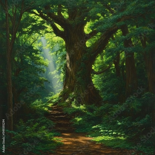 © Fragton, Obraz premium Sunlit Forest Path Leading to Ancient Tree