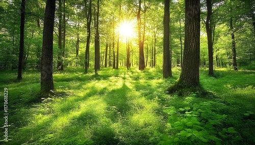 © mukuro, Obraz premium Sunlit Forest Path: Lush Green Trees and Grass