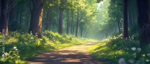 © sea sae, Fototapeta premium Sunlit Forest Path, Lush Green Trees, Pathway, Peaceful