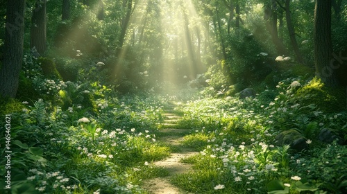Obraz premium Sunlit forest path, lush greenery, wildflowers