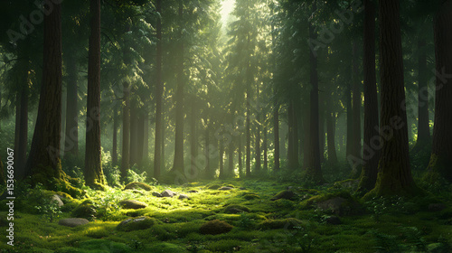 Fototapeta premium Sunlit Forest Path Magical Green Mossy Ground Tall Trees Sunlight Beams