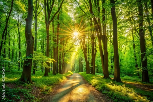 © Arnada, Fototapeta premium Sunlit Forest Path: Minimalist Green Nature Scene Stock Photo