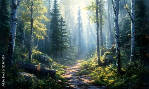© Azril, Fototapeta premium Sunlit Forest Path, Misty Morning, Stone Trail, Game Background