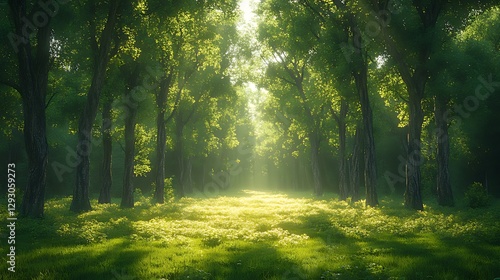 Fototapeta premium Sunlit forest path, morning mist, green trees, idyllic scene, nature background