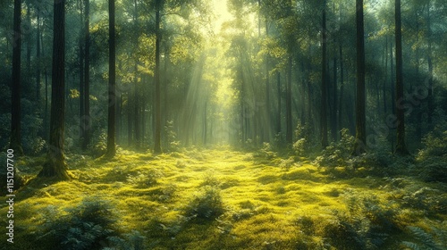 Naklejka premium Sunlit forest path, mossy ground, ethereal.