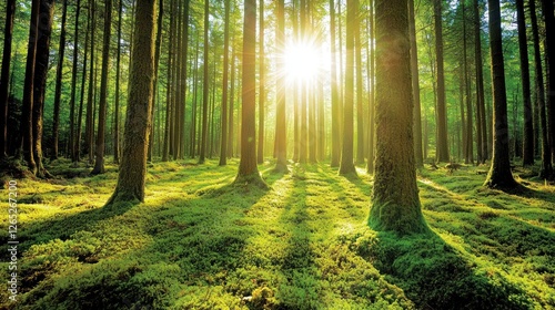 Obraz premium Sunlit Forest Path, Mossy Ground, Sunrise
