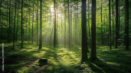 © arri, Obraz premium Sunlit Forest Path Mossy Ground Tree Trunks