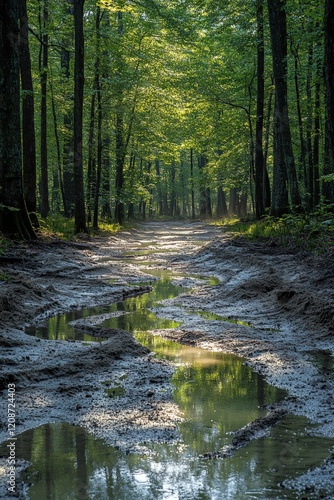 © Ali, Obraz premium Sunlit forest path, muddy, water reflections.