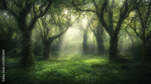 © oris, Fototapeta premium Sunlit Forest Path Mystical Green Trees