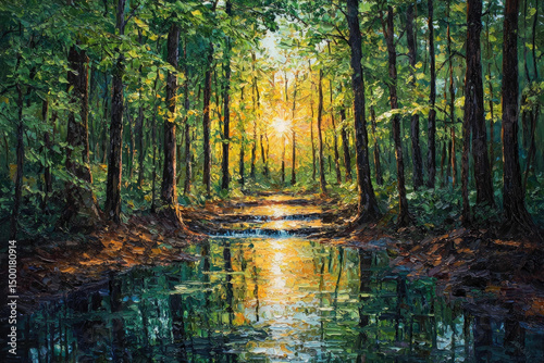 © Vibudhaart, Naklejka premium Sunlit forest path reflected in a tranquil stream, creating a serene and picturesque landscape.