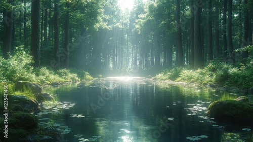 © wahyu, Fototapeta premium Sunlit Forest Path Reflecting in Calm Water