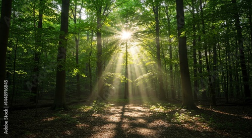 © mh, Obraz premium Sunlit Forest Path: Serene Greens and Golden Rays