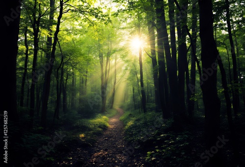 © Pungkas, Obraz premium Sunlit Forest Path: Serene Woodland Scene with Light Rays Streaming Through Trees