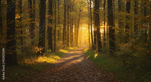 © baasith88, Obraz premium Sunlit Forest Path Surrounded by Autumn Trees with Golden Leaves