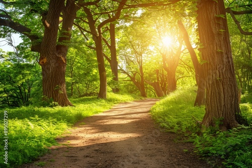 Fototapeta premium Sunlit forest path surrounded by lush green trees and foliage