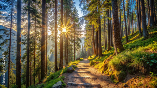 © Olga, Obraz premium Sunlit forest path surrounded by tall trees