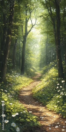 © BrandwayArt, Obraz premium Sunlit forest path surrounded by vibrant greenery