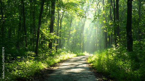 Naklejka premium Sunlit Forest Path Through Dense Green Trees with Bright Sunlight and Shadow