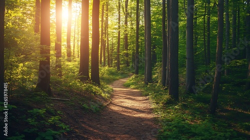 © MASJAB, Obraz premium Sunlit Forest Path Through Lush Green Trees