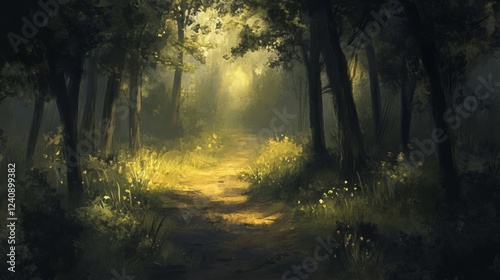 © Sleeping Carbuncle, Obraz premium Sunlit Forest Path Through Misty Woods