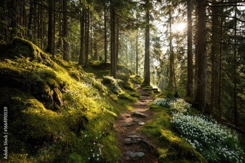 © Akbar, Fototapeta premium Sunlit forest path through moss-covered rocks