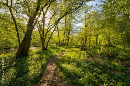 © VisualCrafter, Naklejka premium Sunlit forest path through vibrant greenery