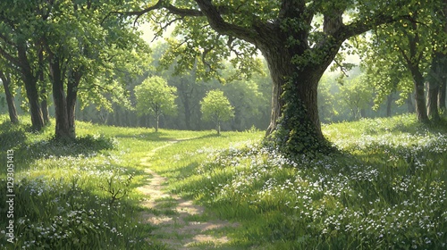 © Soto, Obraz premium Sunlit Forest Path Through Wildflower Meadow