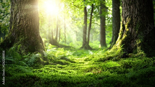 © isend, Obraz premium Sunlit Forest Path: Tranquil Mossy Green Haven