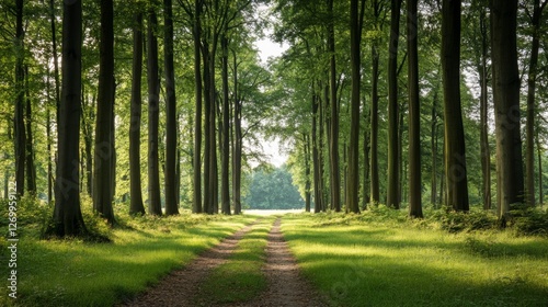 Fototapeta premium Sunlit Forest Path, Tranquil Woods, Peaceful Nature Scene, Perfect for Calm...