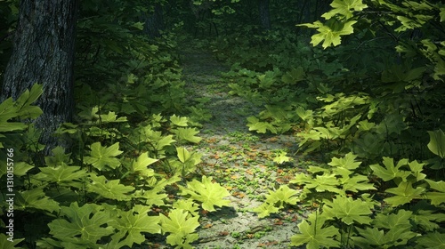 Fototapeta premium Sunlit forest path, vibrant foliage, dappled light, mystical atmosphere