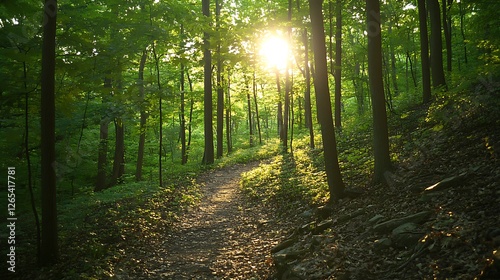 Obraz premium Sunlit Forest Path Winding Through Green Trees