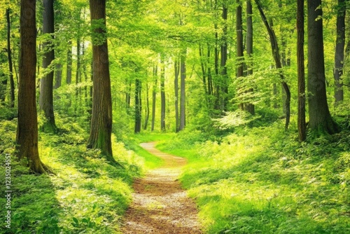 Naklejka premium Sunlit forest path winding through lush green trees, creating a peaceful and refreshing atmosphere in nature