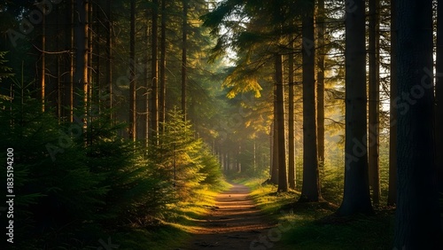 Obraz premium Sunlit forest path winding through tall trees with golden light creating a...