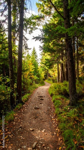© Fajar, Obraz premium Sunlit forest path winds through autumnal trees