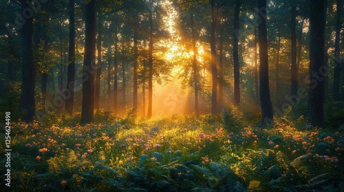 © abrardsgn, Fototapeta premium Sunlit Forest Path with Blooming Flowers