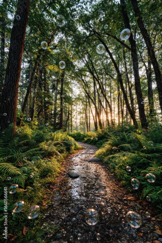 Fototapeta premium Sunlit forest path with bubbles