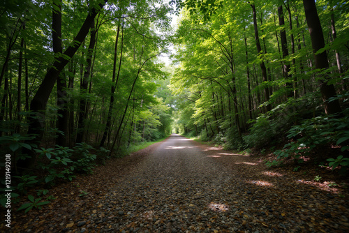 Obraz premium Sunlit forest path with dappled light