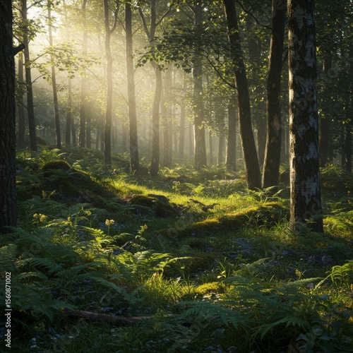 © SweaterWeather, Obraz premium Sunlit Forest Path with Fog and Lush Greenery