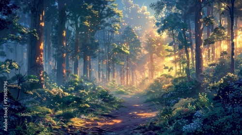Obraz premium Sunlit Forest Path With Glowing Lights