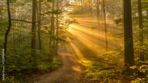 © Cheung, Fototapeta premium Sunlit forest path with golden rays through trees, a serene nature escape