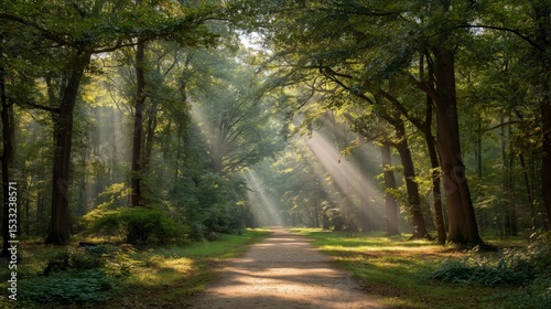 © Yicheng, Fototapeta premium Sunlit forest path with golden rays through trees, a serene nature escape