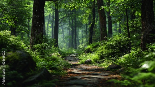 Fototapeta premium Sunlit forest path with lush green foliage and stone steps leading into the...