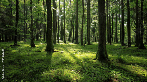 Fototapeta premium Sunlit Forest Path with Lush Green Grass and Towering Trees